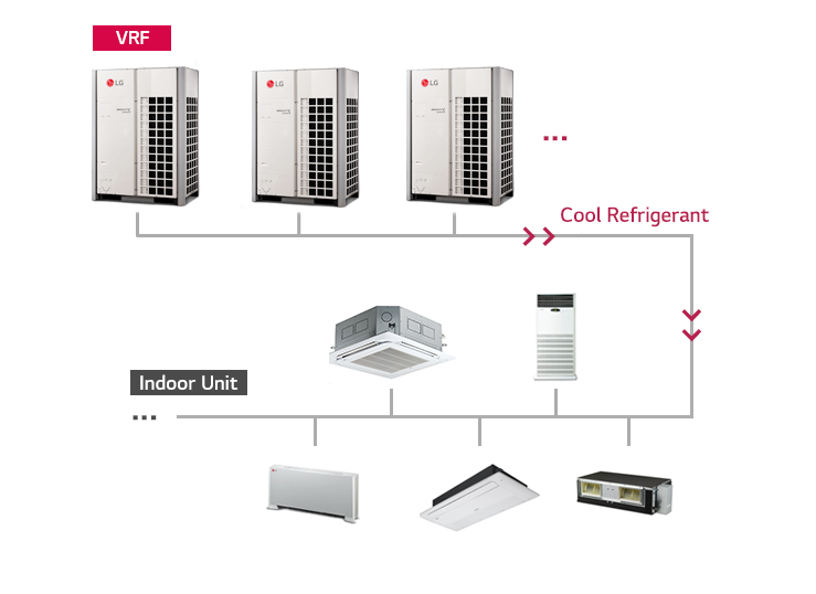 • The VRF system relies on refrigerant alone instead of a water-based cooling system. Without chillers or coils, a VRF system is quick, responsive, and adaptive to outdoor conditions.